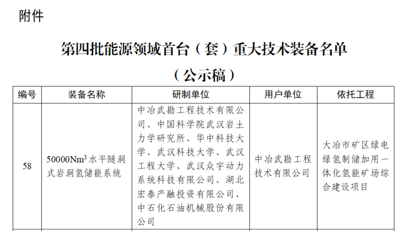 近日,国家能源局发布了《第四批能源领域首台(套)重大技术装备名单》(国家能源局公告 2025年第1号),由中冶武勘携手中国科学院武汉岩土力学研究所、华中科技大学、武汉科技大学等科研机构、产业链上下游企业共同研发的“50000Nm3水平隧洞式岩洞氢储能系统”上榜,获得能源领域首台(套)重大技术装备认定。
